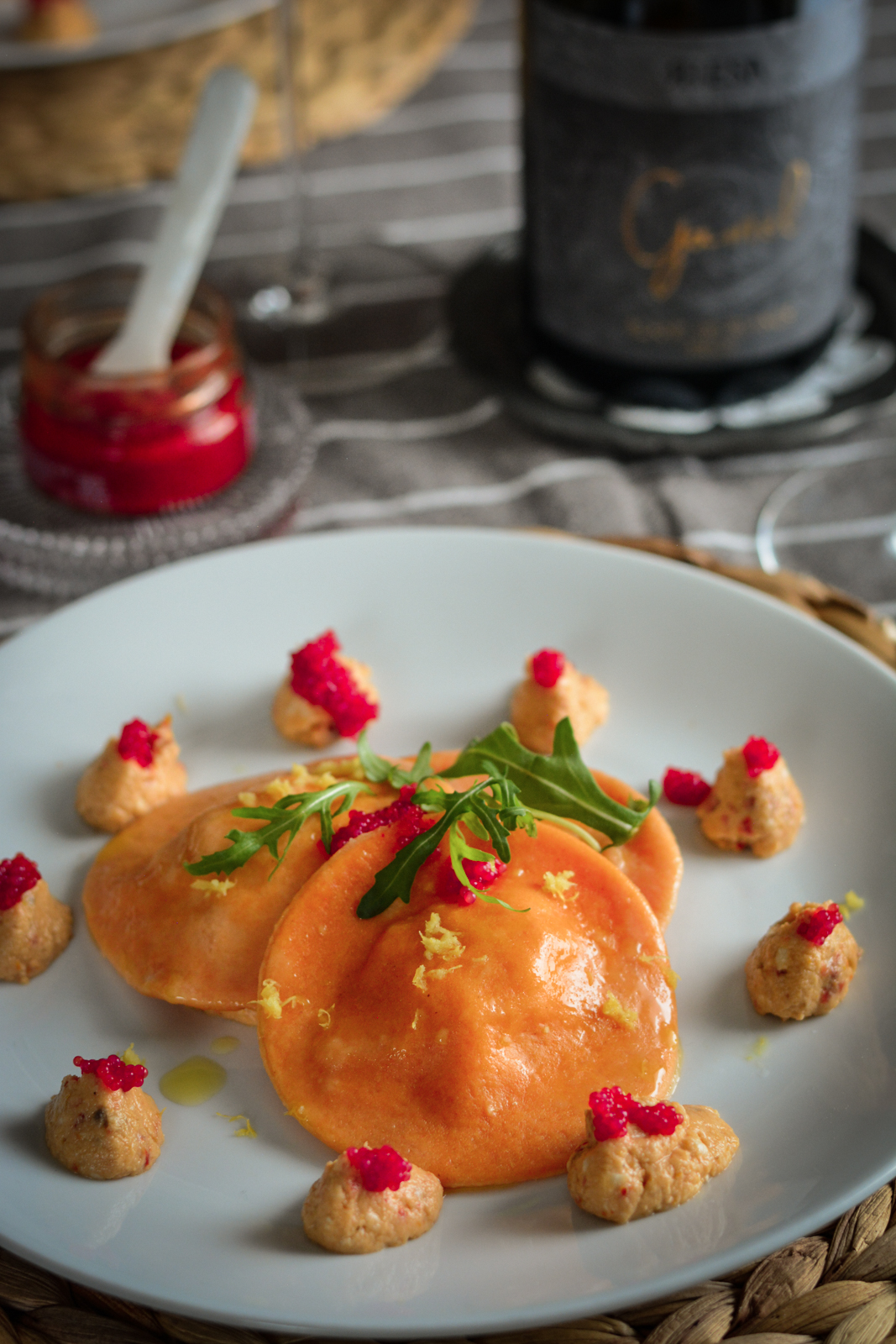 - Cuocete in acqua bollente salata per 3-4 minuti, scolateli delicatamente e impiattate con la crema di bufala e pomodori secchi, un giro di olio extravergine, completate con uova di lompo, qualche foglia di rucola e una grattugiata di limone bio.